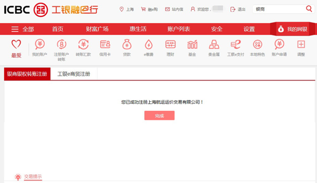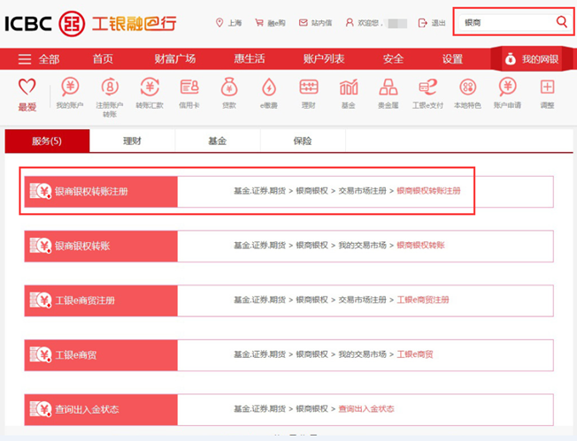 第一步:登錄工商銀行個(gè)人網(wǎng)上銀行,搜索“銀商”,搜索結(jié)果如下圖所示后,點(diǎn)擊“銀商銀權(quán)注冊(cè)”。