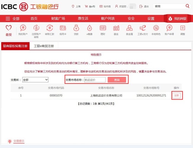 第二步:在“交易市場(chǎng)名稱(chēng)”一欄搜索“航運(yùn)運(yùn)價(jià)”,點(diǎn)擊“查詢”,搜索結(jié)果如下圖所示后,點(diǎn)擊“注冊(cè)”。