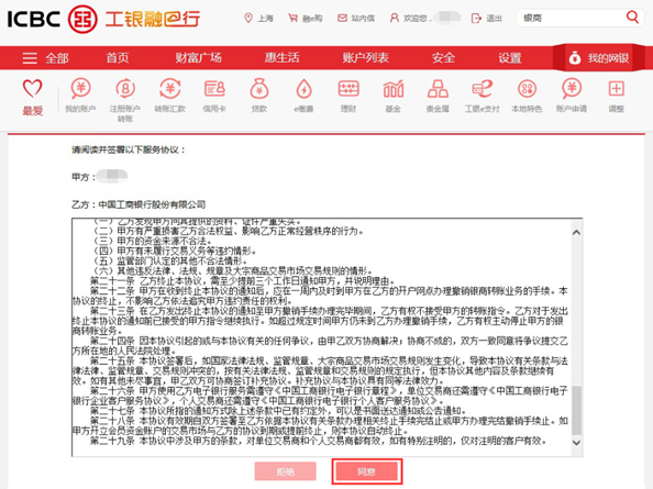 第三步:閱讀《中國(guó)工商銀行電子銀行集中式銀商轉(zhuǎn)賬協(xié)議》后,點(diǎn)擊“同意”進(jìn)入后續(xù)注冊(cè)流程。