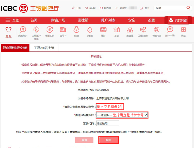 第四步:在“請(qǐng)錄入會(huì)員交易資金賬號(hào)“一欄中填寫(xiě)您的交易商編碼;在“請(qǐng)選擇結(jié)算賬戶”中選擇您要綁定的工商銀行賬戶(必須為借記卡賬戶),填寫(xiě)完畢后選擇“提交”。