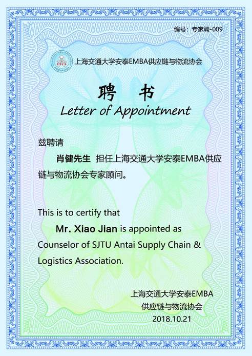 肖健的主題演講時長1個小時,內(nèi)容分為三部分:剖析中美貿(mào)易戰(zhàn)對于航運市場的影響、企業(yè)如何運用航運運價衍生品進行風險管控、實例解讀套期保值的應用方式。通過介紹衍生品的成長史以及航貿(mào)大數(shù)據(jù)分析,肖健循循善誘、深入淺出地介紹集裝箱運價衍生品的發(fā)展歷程、設計理念與應用場景。交大安泰學院EMBA學員仔細聽講,掌聲不斷,會后又有不少學員與肖健作了進一步的深入溝通與探討。此外,深圳市易流科技股份有限公司創(chuàng)始人、西安交通大學管理學院和研究生院博士生導師黃濱深入探討了“新零售、新經(jīng)濟、新物流背景下的物流透明管理”,以色列高德拉特咨詢有限公司TOC咨詢師、中國供應鏈管理人俱樂部執(zhí)行委員張峰詳細介紹了“供應鏈第一原理”。肖健等三位演講嘉賓被受聘為“上海交通大學安泰學院EMBA供應鏈和物流協(xié)會專家顧問”。