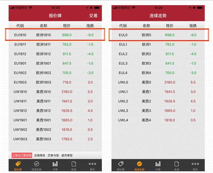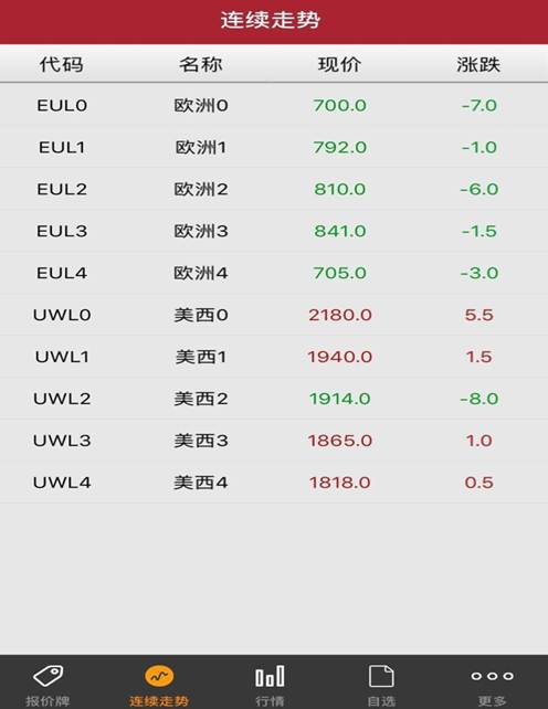 打開“航運(yùn)運(yùn)價(jià)交易”手機(jī)客戶端,交易界面默認(rèn)出現(xiàn)“上海出口集裝箱”的報(bào)價(jià)牌,反映各個(gè)合約的最新行情動態(tài)。下欄中“連續(xù)走勢”可以查看到“連續(xù)合約”(見圖1)。合同代碼前兩個(gè)字母EU、UW分別是上!?dú)W洲航線和上!牢骱骄的縮寫;第三個(gè)字母L是“連續(xù)”的漢語拼音首字符;第四個(gè)是數(shù)字,代表連續(xù)第幾個(gè)月。目前,可以分別查詢歐洲和美西兩大合同的“連0”“連1”“連2”“連3”和“連4”各5個(gè)“連續(xù)合約”。