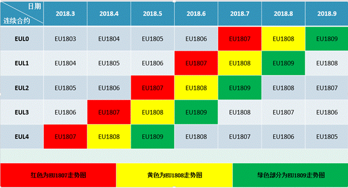 2019年3月,交易商如需回查EU1902合約的歷史走勢,可以查看EUL4的2018年10月趨勢圖+EUL3的11月份趨勢圖+EUL2的12月份趨勢圖+EUL1的2019年1月趨勢圖+EUL0的2月份趨勢圖。由于交易軟件推出的是當(dāng)月至隨后4個(gè)月合約的連續(xù)走勢,因此EUL4的首月走勢圖無法查詢。