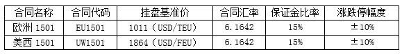 上海出口集裝箱運(yùn)力交易合同,歐洲航線EU1501和美西航線UW1501定于2014年07月07日上市交易,其中EU1501和UW1501的最后交易日為2015年01月09日,最后交收日為2015年01月24日。首日上市合同基本參數(shù)如下: