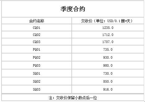 國(guó)際干散貨運(yùn)力交易合同,海岬型干散貨船CC1501、CC1502、CC1503、CQ1501、CQ1502、CQ1503;巴拿馬型干散貨船PC1501、PC1502、PC1503、PQ1501、PQ1502、PQ1503;超靈便型干散貨船SC1501、SC1502、SC1503、SQ1501、SQ1502、SQ1503于2014年12月31日進(jìn)行交收,下表為交收合同價(jià)格。