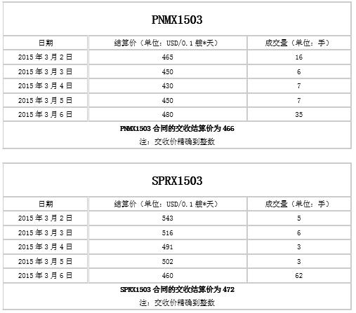 國(guó)際干散貨期租運(yùn)力交易合同PNMX1503、SPRX1503于2015年3月13日進(jìn)行交收,下表為交收合同交收結(jié)算價(jià)計(jì)算參數(shù):