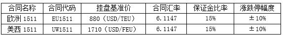 上海出口集裝箱運(yùn)力交易合同EU1511、UW1511定于2015年5月11日上市交易,其中EU1511和UW1511的最后交易日為2015年11月06日,最后交收日為2015年11月21日,首日上市合同基本參數(shù)如下: