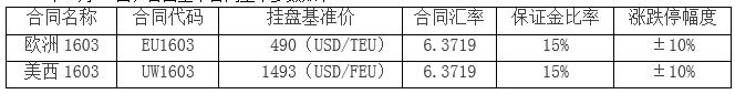 上海出口集裝箱運(yùn)力交易合同歐洲航線EU1603、美西航線UW1603定于2015年9月14日上市交易,其中EU1603和UW1603的最后交易日為2016年3月04日,最后交收日為2016年3月19日,首日上市合同基本參數(shù)如下: