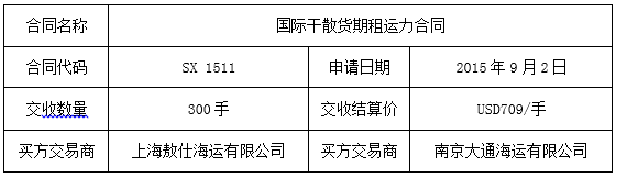 經(jīng)買方交易商上海敖仕海運有限公司和賣方交易商南京大通海運有限公司協(xié)商一致,國際干散貨期租運力交易合同超靈便型船(合同代碼:SX1511)于2015年9月2日進(jìn)行協(xié)議交收,并依據(jù)《上海航運運價交易有限公司國際干散貨期租運力交收細(xì)則》予以執(zhí)行。